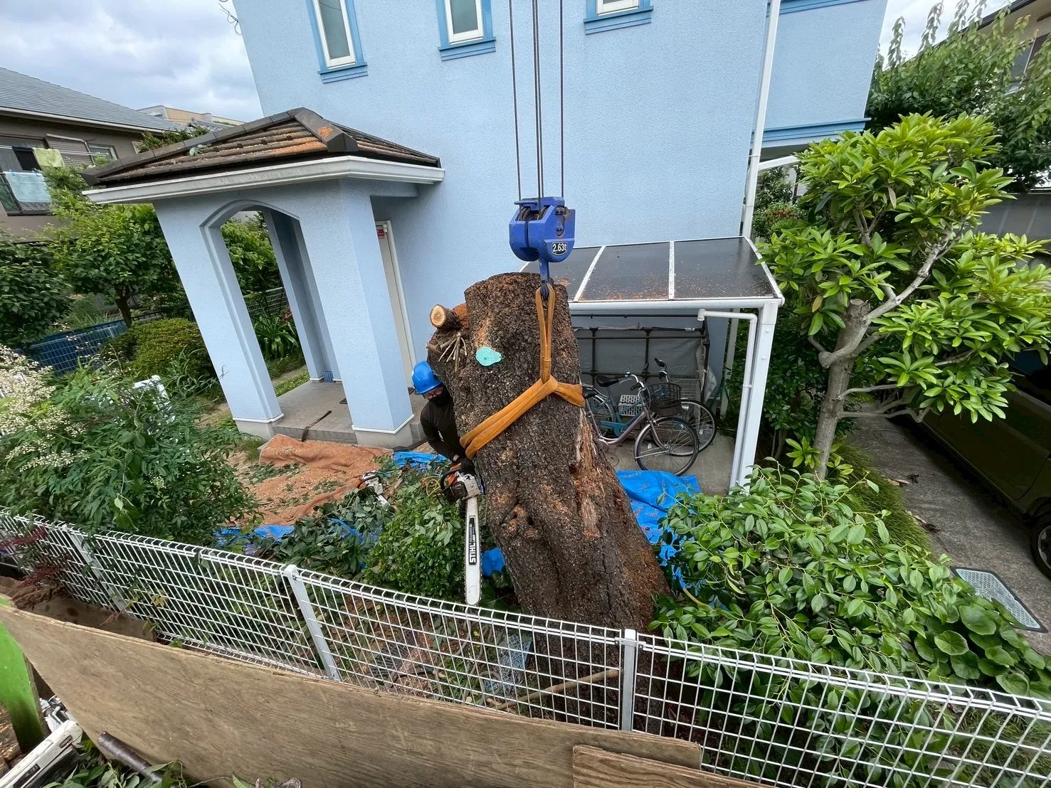 樹木の状態、工程について綿密に打ち合わせを行い、3tユニックを使用してツリークライミングでの吊るし切りで伐採作業を進めていきました。